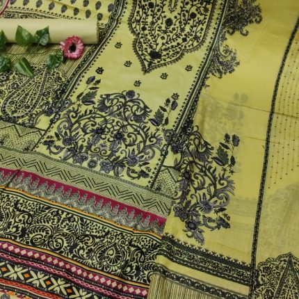 বিন সাইদ কটন থ্রি পিস ফুল বডি মেইল প্রিন্ট জামার বুকে এমব্রয়ডারি করা ওরনা পাঁচ হাত বড় ওরনা সালোয়ার কটন
